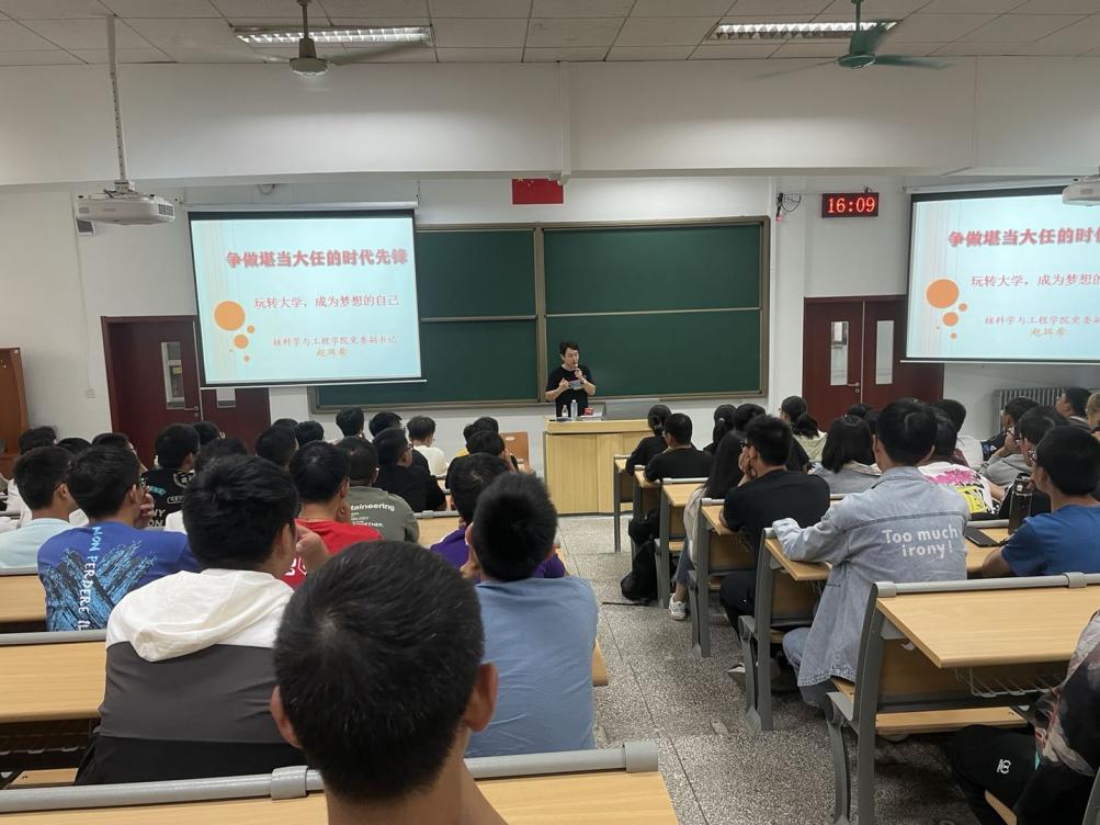 赵珥希老师首先对新生同学们的到来表示欢迎,他指出大学生活精彩纷呈,把握未来才能拥有无限的可能。同时也对新生提出以下几点要求:一是把握机遇、与时俱进,他说我国力争2030年前实现碳达峰,2060年前实现碳中和,这是党中央作出的重大战略决策,核能是作为国家“十四五”规划加快推动经济社会发展全面绿色转型的战略举措中的重要组织部分,核学院学子要把握住这个机会,为祖国核电事业添砖加瓦;二是目标明确、扎实基础,要提前规划未来的道路,从事任何职业都需要同学们学习本领过硬、有较强的创新能力,努力成为一名综合素质全面发展的优秀大学生;三、充分利用好课余时间,多学习其他的知识技能,多参加社会实践了解社会,每天为梦想奋斗一小时,让自己的大学生活像阳光般灿烂,让青春之花最终绽放在祖国最需要的地方。