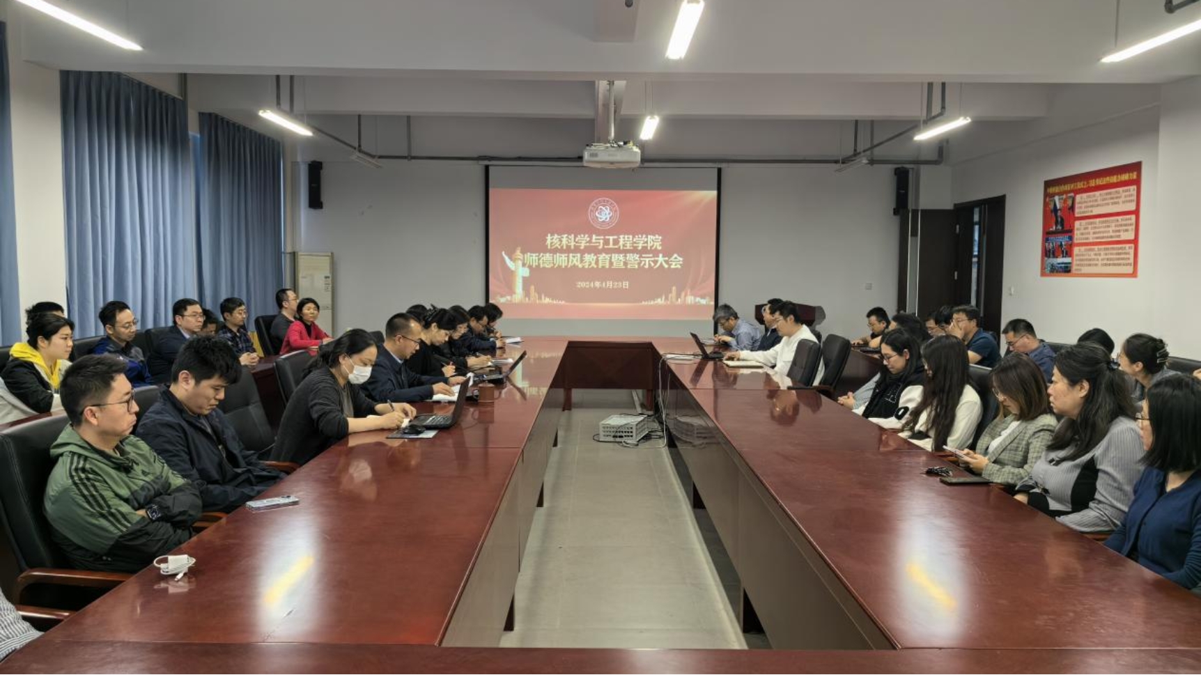 在主楼G209会议室召开2024年教职工师德师风教育暨警示大会,学院领导班子成员及全体教职工参加会议。会议由学院党委书记李林主持。