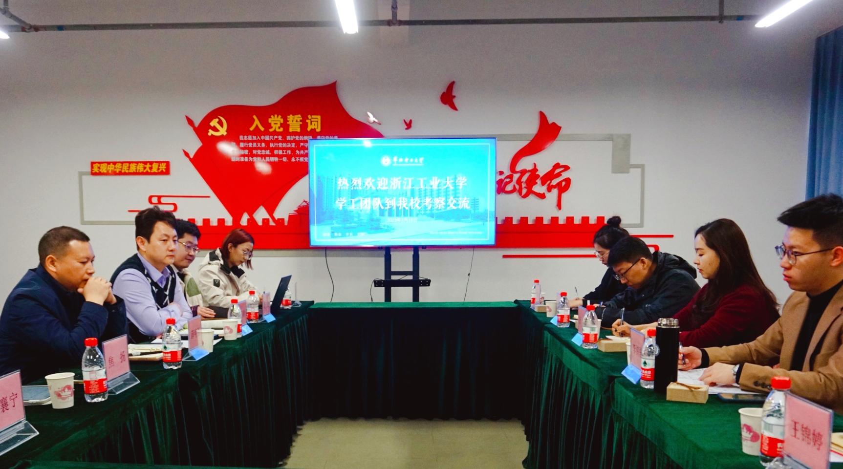 座谈会上,赵珥希、薛明磊对浙江工业大学同仁的来访表示热烈欢迎。浙江工业大学金鑫对两个学院热情接待表示感谢,说明了此次调研的目的和希望交流的几方面问题,双方围绕学生工作、辅导员队伍建设等展开交流。