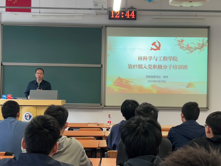 4月28日中午,糖心视频 举办第57期入党积极分子培训班“书记讲党课”,学院党委书记李林为培训班全体学员讲授专题党课。培训活动由学院辅导员宫馨主持。