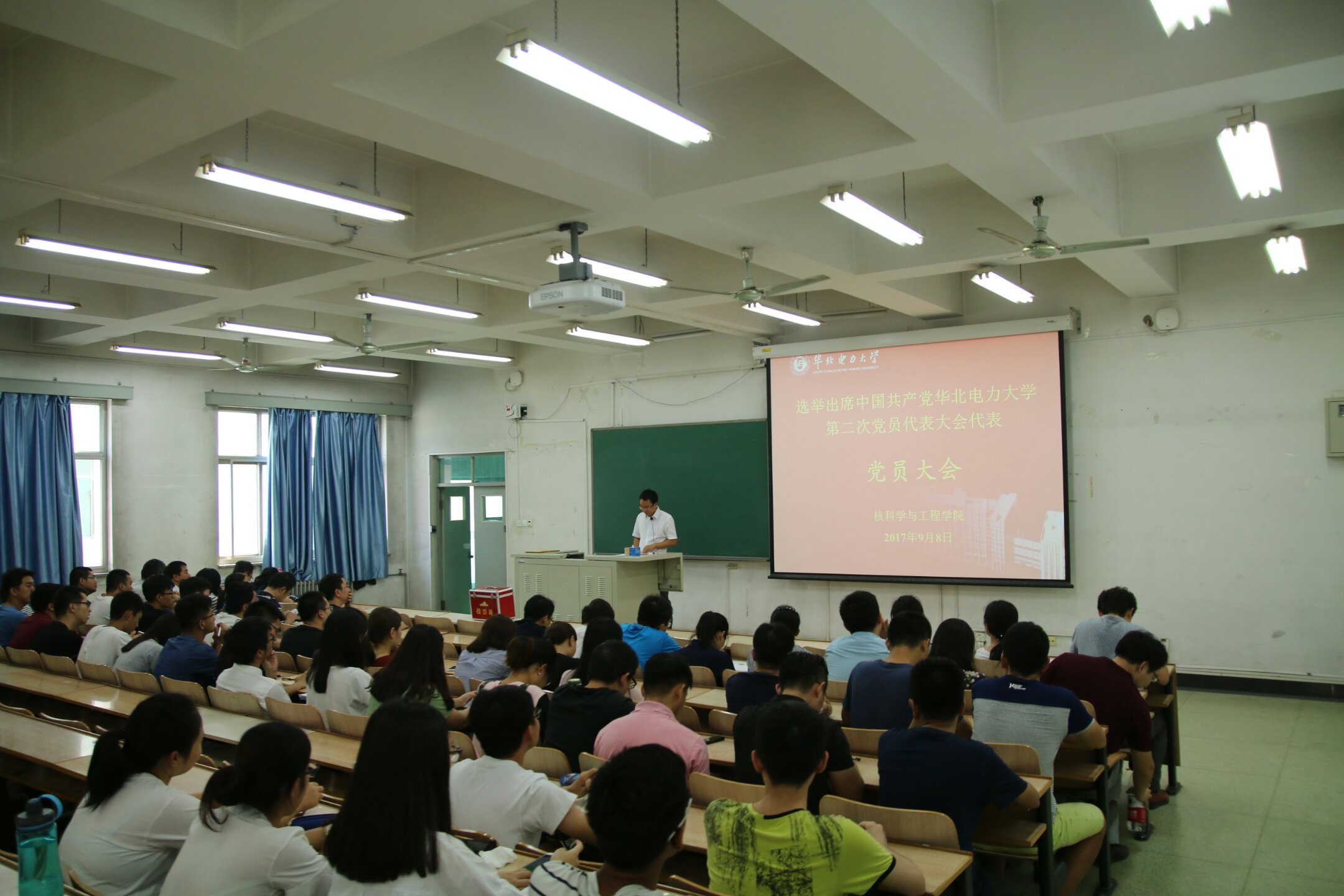 为了迎接党的十九大,选举出席中国共产党糖心视频 第二次党员代表大会代表,2017年9月8号中午12:50,糖心视频 于教三C201召开党员大会,大会由糖心视频 党委副书记李辉主持,核学院全体师生党员参会。
