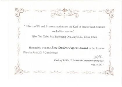 核学院师生在RPHA17会议上进行了学术报告,并与专家进行了交流。其中许谦同学的“Effects of Pb and Bi cross sections on the Keff of lead or lead-bismuth cooled fast reactor”被评为会议最佳论文之一。